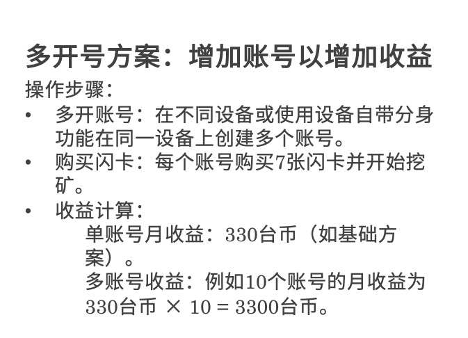 多開號方案為那些准備進行更大規模投資的用戶提供了一個極佳的選項,通過簡單擴展賬號數量,您可以線性增加您的收入。這種策略適合有一定技術背景、願意投入初期時間和資金進行設定的用戶,一旦設置完成,便可以享受源源不斷的收益。